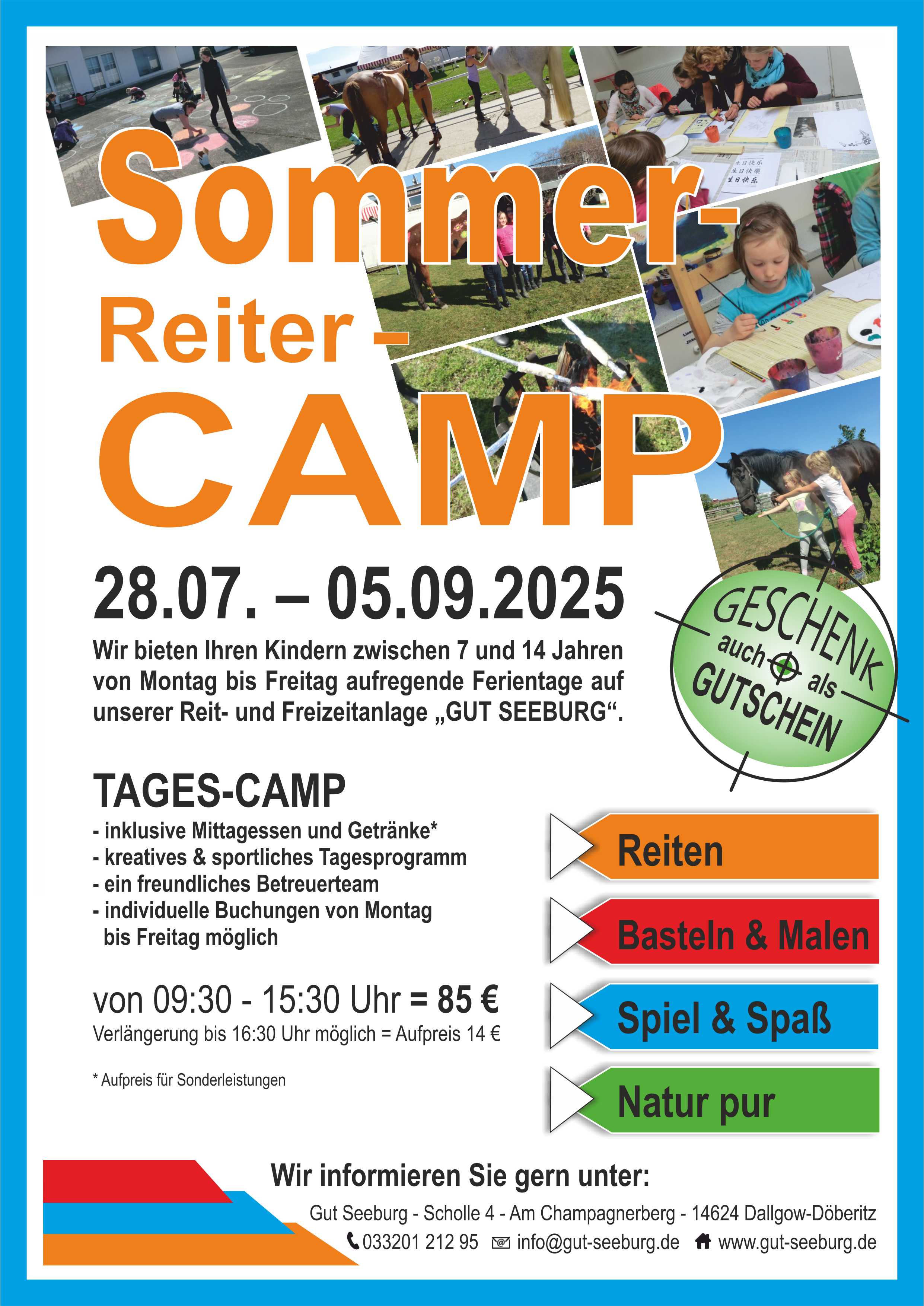 Sinnvolle Freizeitgestaltung, bei der sich Jungen und Mädchen aktiv und phantasievoll austoben können. Zum Camp-Programm gehören Reiten unter professioneller Anleitung, Freizeitspiele, Basteln und Malen. Aber natürlich werden auch Theorieinhalte wie „Alles rund ums Pferd“ (Pflege, Futter und Umgang) praxisnah und altersgerecht vermittelt. Die Inhalte bieten eine tolle Kombination, durch die die Kinder nicht nur spielend Koordination, Teamgeist und Verantwortungsbewusstsein lernen, sondern auch, wie man der eigenen Kreativität Ausdruck verleiht.